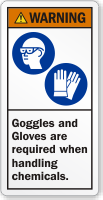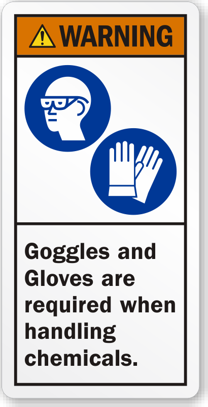 Carry out your responsibility and pre-inform employees that wearing goggles and gloves is required while working with chemicals. Use this ANSI label inside the lab of your facility.