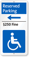 Dictate to those parking in your lot that it is illegal and punishable by $250 fine to park to the left in reserved spaces for handicapped visitors with this revamped design parking sign.