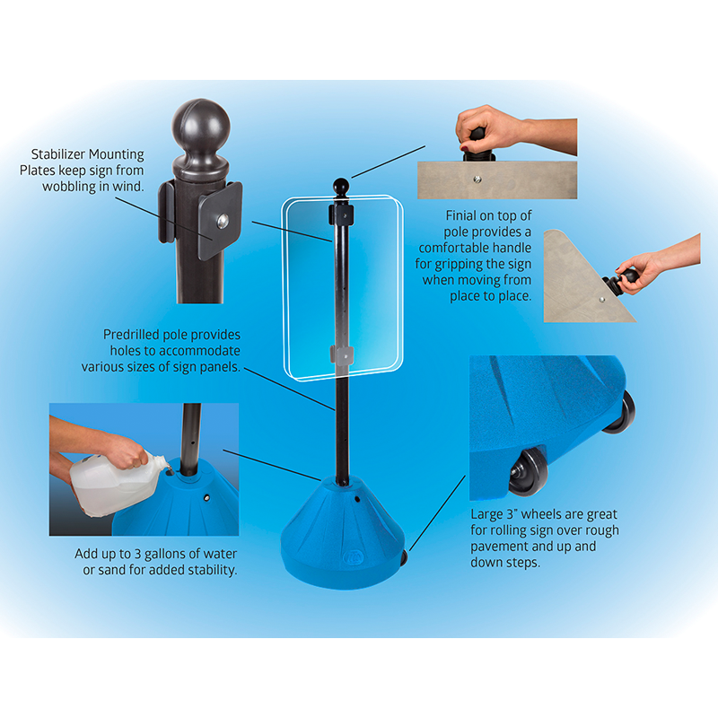 Roll 'n' Pole Sign Holder can be configured for a myriad of different locations and environments. Handicapped Blue base is great for displaying temporary handicap parking signs and other regulatory.