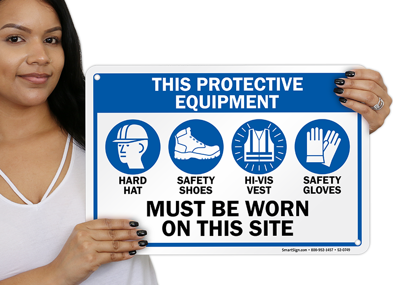 PPE Sign: This Protective Equipment Must Be Worn On This Site - Hard Hat, Safety Shoes, Hi-Vis Vest, Safety Gloves (With PPE Symbols)