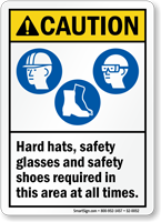 ANSI Caution Wear PPE Sign: Hard Hats, Safety Glasses And Safety Shoes Required In This Area At All Times (With Graphic)