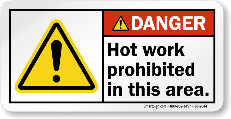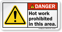 Reinforce workplace regulations with ANSI Danger labels. This one prohibits hot work in an area. Apply it and ensure that no one ignores potential dangers.