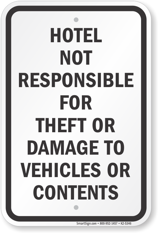 Specially designed for hotels, this Not Responsible For Theft Or Damage To Vehicles Or Contents Sign reduces your liability as a hotel owner or manager.