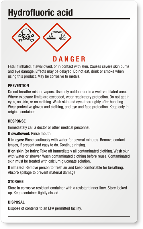 Hydrofluoric Acid's containers should be marked with this fully compliant GHS Chemical Label so that workers, not just in US, but around the world can understand the chemical's details and practice safety.