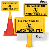 Alert people to the dangers of icy surfaces in parking lots with this highly visible no-tip, portable Traffic Cone Sign.