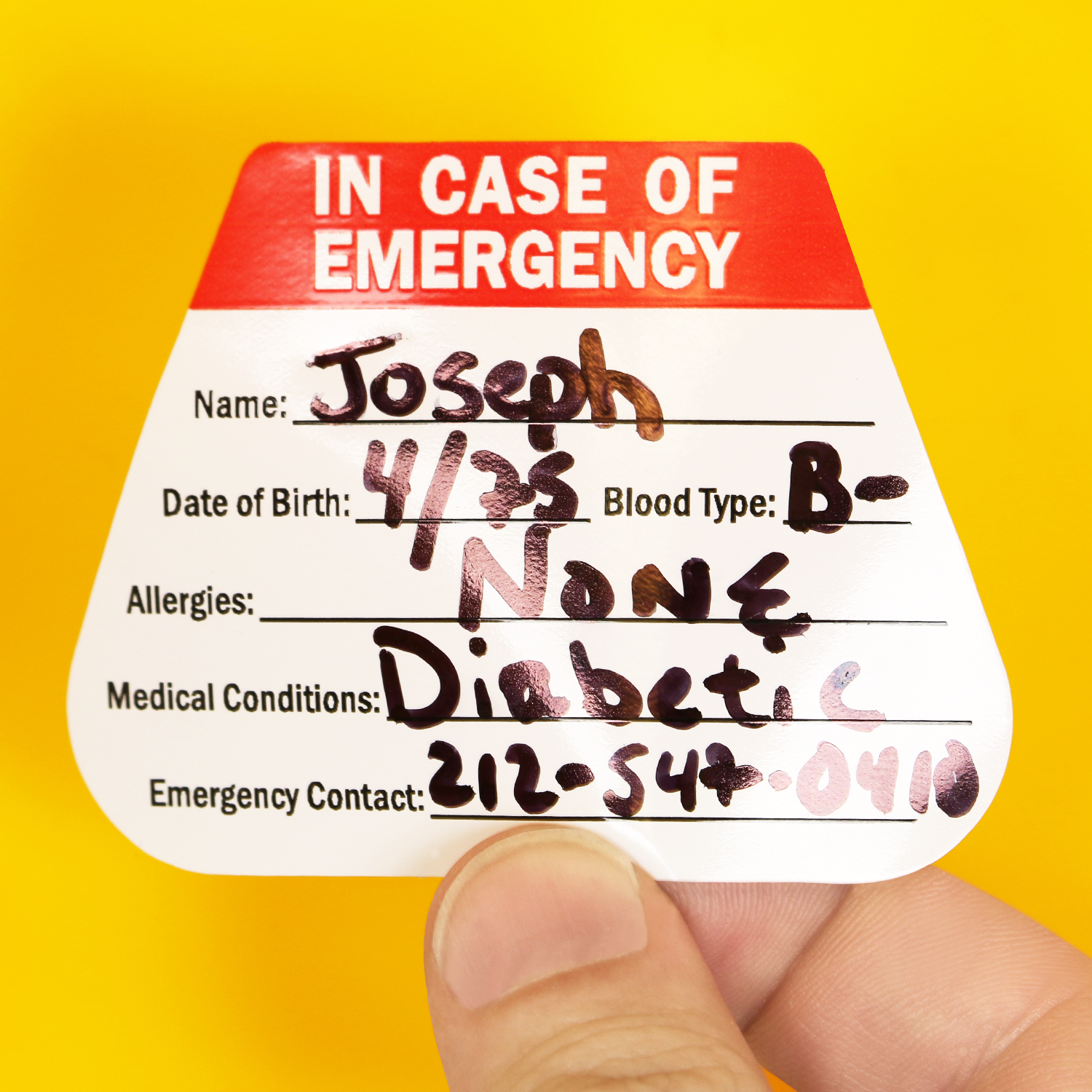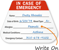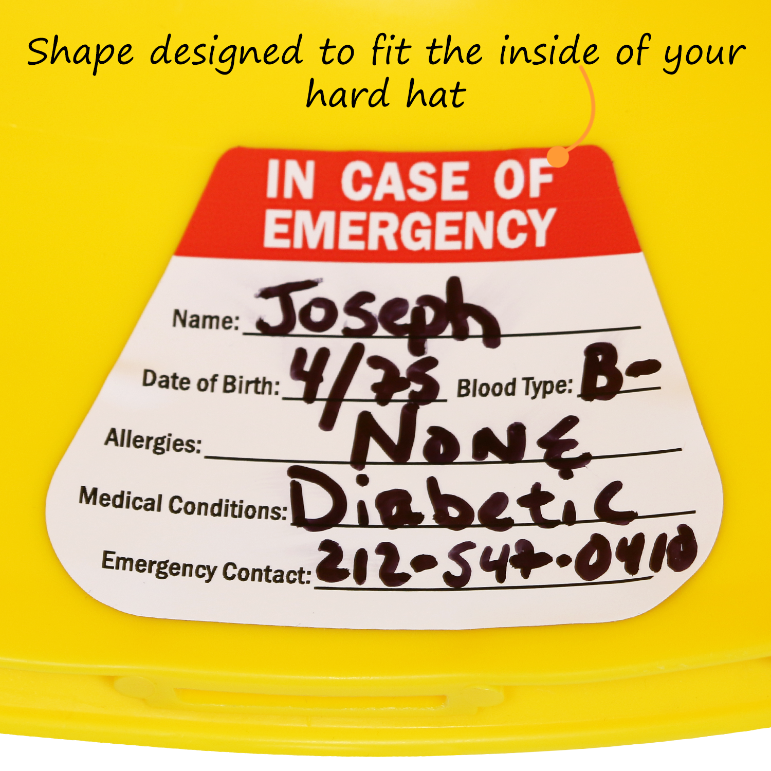 Ensure first responders can quickly locate vital information like name, blood type, allergies, medical conditions, and more on this 'In Case Of Emergency' Hard Hat Label.Â