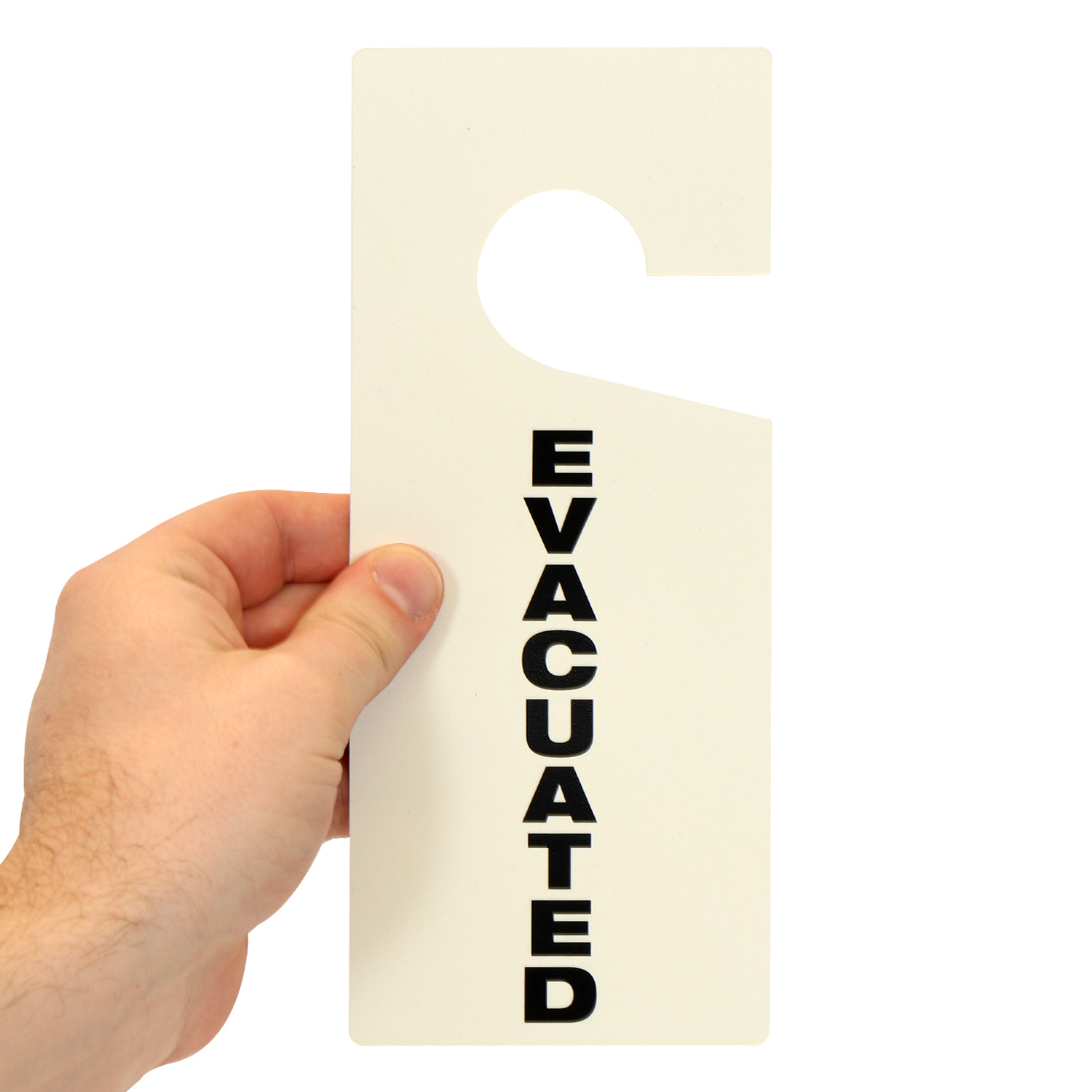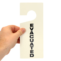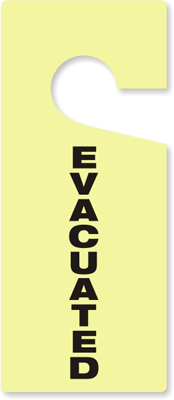 During evacuation procedures, tags help to quickly identify if a room or area has been ‘evacuated’ with a quick visual cue. Last person out, in charge of the room or personnel, hangs the tag indicating no one is left or that the area is ‘evacuated’. Simply place durable, tear-resistant hangers on door knob handles or hooks to quickly recognize the ‘evacuated’ location and move on to other rescue operations.