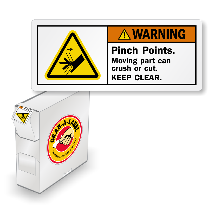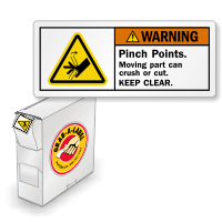 Remind workers about safe workplace tactics. ISO Pinch Points Labels make it easy to put powerful reminders in all the right places. Rolls of 250 labels come with a convenient label dispenser. Extremely durable handy label dispenser box goes where you need it. Polyolefin is waterproof, tear resistant, grease resistant, and endures shifts or changes in temperature. The laminate protects against scuffs, acids, chemicals and oils.