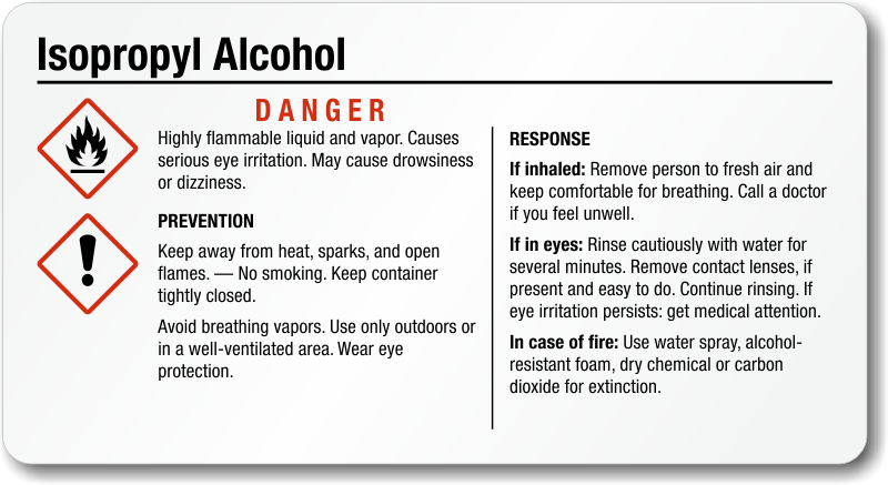 Isopropyl Alcohol GHS Label: Chemical Danger, Highly Flammable Liquid And Vapor, Causes Serious Eye Irritation and Drowsiness or Dizziness with Prevention and Response Instructions GHS-029-C Learn More...