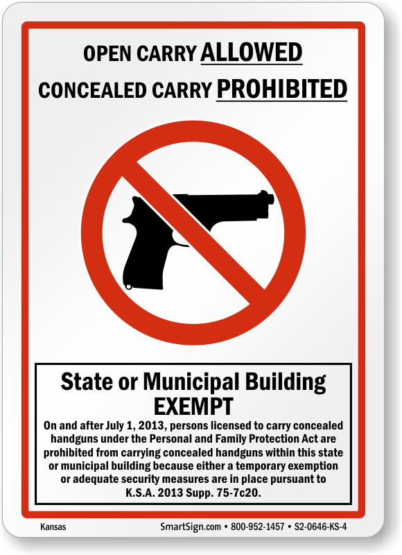 Use this Kansas Gun Law Sign to prohibit concealed carry of handguns inside state or municipal buildings. Sign helps you comply with K.S.A 2013 Supp. 75-7c20.