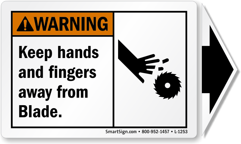 Make workers aware of the dangers they are exposed to while using machinery. Post a warning and ask them to keep hands and fingers away from the moving blade. Use this ANSI warning label with a detachable arrow.