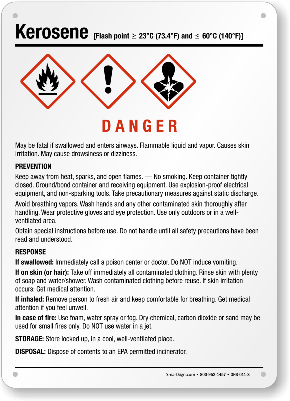 Kerosene (Flash point = 23°C) may be fatal if swallowed and enters airways. Inform worker of the necessary precautions to take, with our Kerosene GHS Chemical Sign.