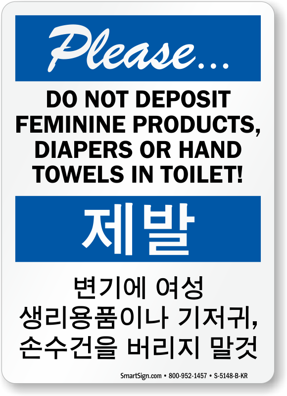 Politely ask your female employees and visitors to refrain from depositing female hygiene products in the toilet. Use this sign to communicate with Korean and English speaking people.