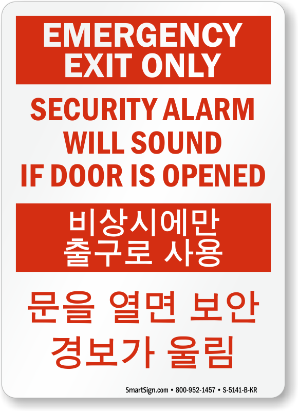 Let everyone know that security alarm will sound if they leave the emergency exit door open. Utilize this Bilingual Fire and Emergency sign that communicates with English and Korean speaking workers/visitors.