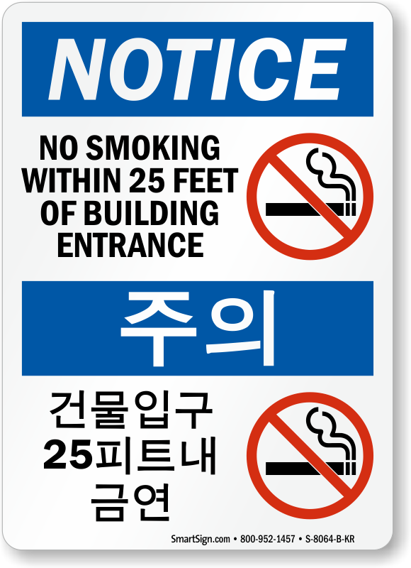 This Bilingual OSHA Notice sign will cater to your Korean and English speaking workers/visitors both. Use this to maintain safety and ensure comfort of others by regulating smoking around your building.