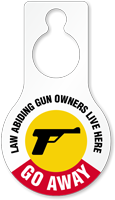 Humorous Pear Shaped Plastic Door Hang Tag: Law Abiding Gun Owners Live Here Go Away (with Gun Symbol) TG-1453