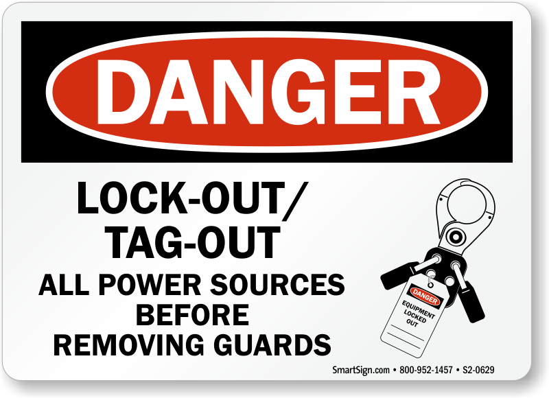 OSHA Danger Sign: Lock-out/ Tag-out All Power Sources Before Removing Guards (With Graphic) S2-0629