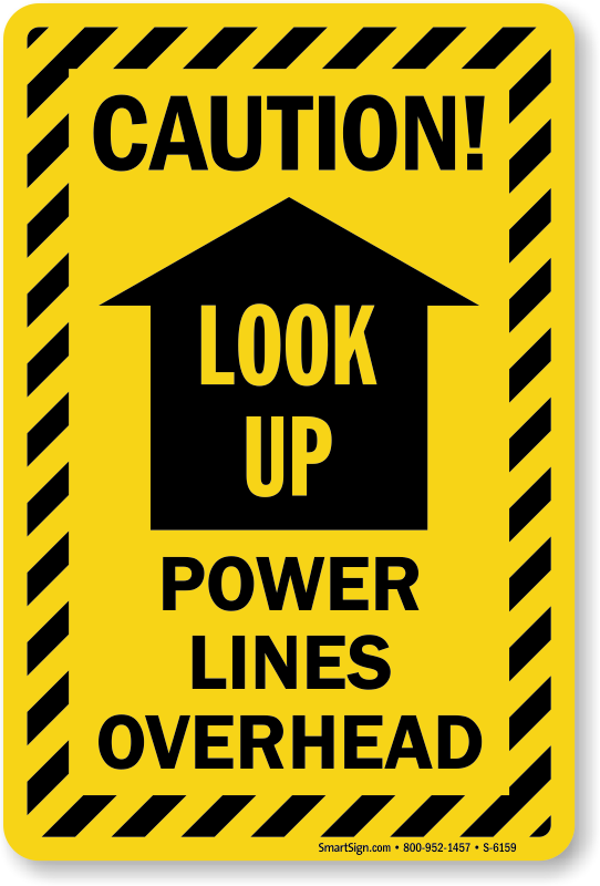 This bright yellow 'Power Lines Overhead' sign is hard to miss!