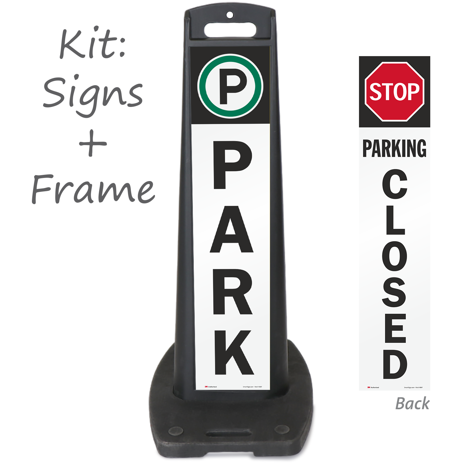 Sign panel and base are stackable for compact storage.