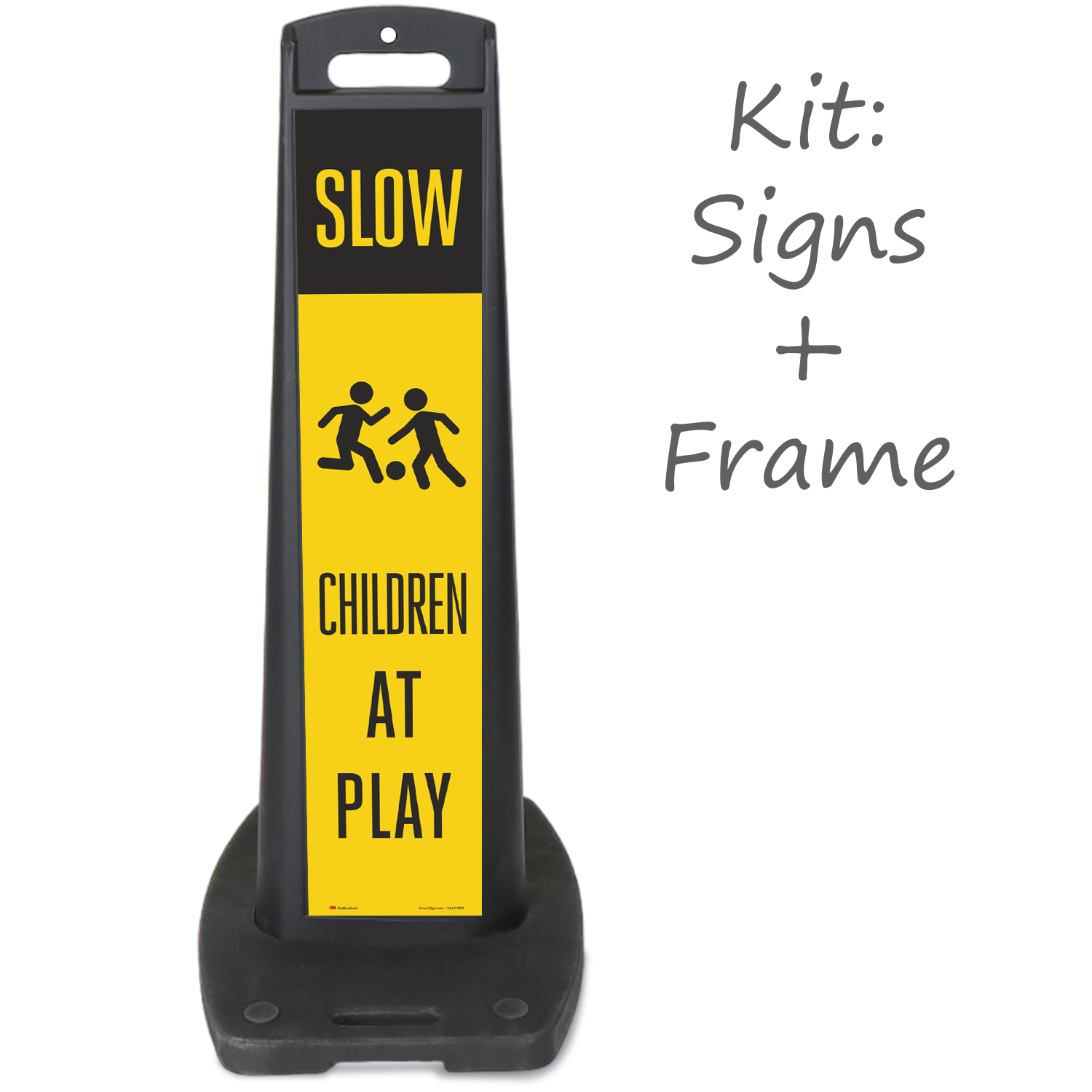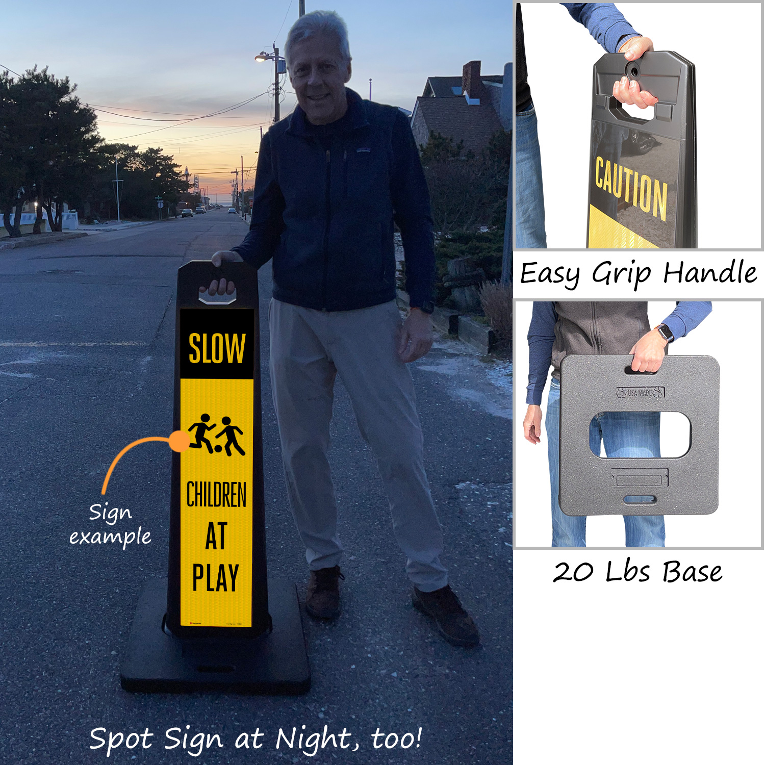 Sign panel and base are stackable for compact storage.