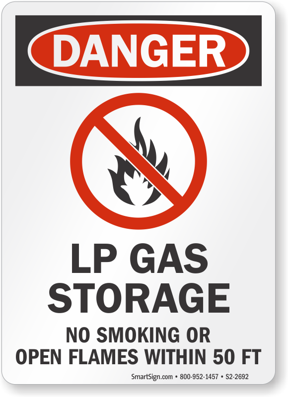 OSHA Danger Sign: LP Gas Storage, No Smoking Or Open Flames Within 50 Ft