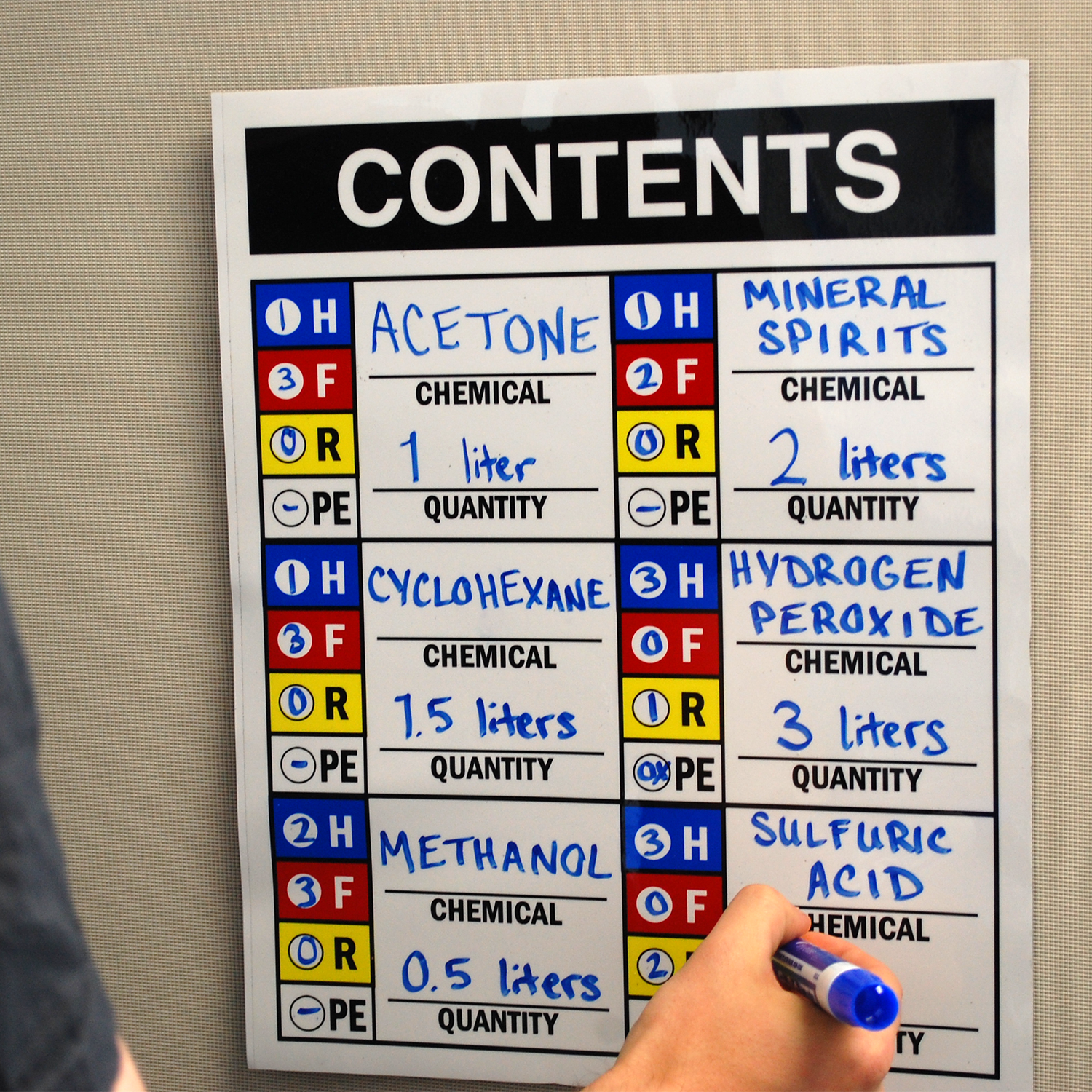 - Adheres to any steel cabinet and can be removed without any difficulty - no more sticky adhesive residue. Includes space for identifying up to six chemicals along with their quantities.
