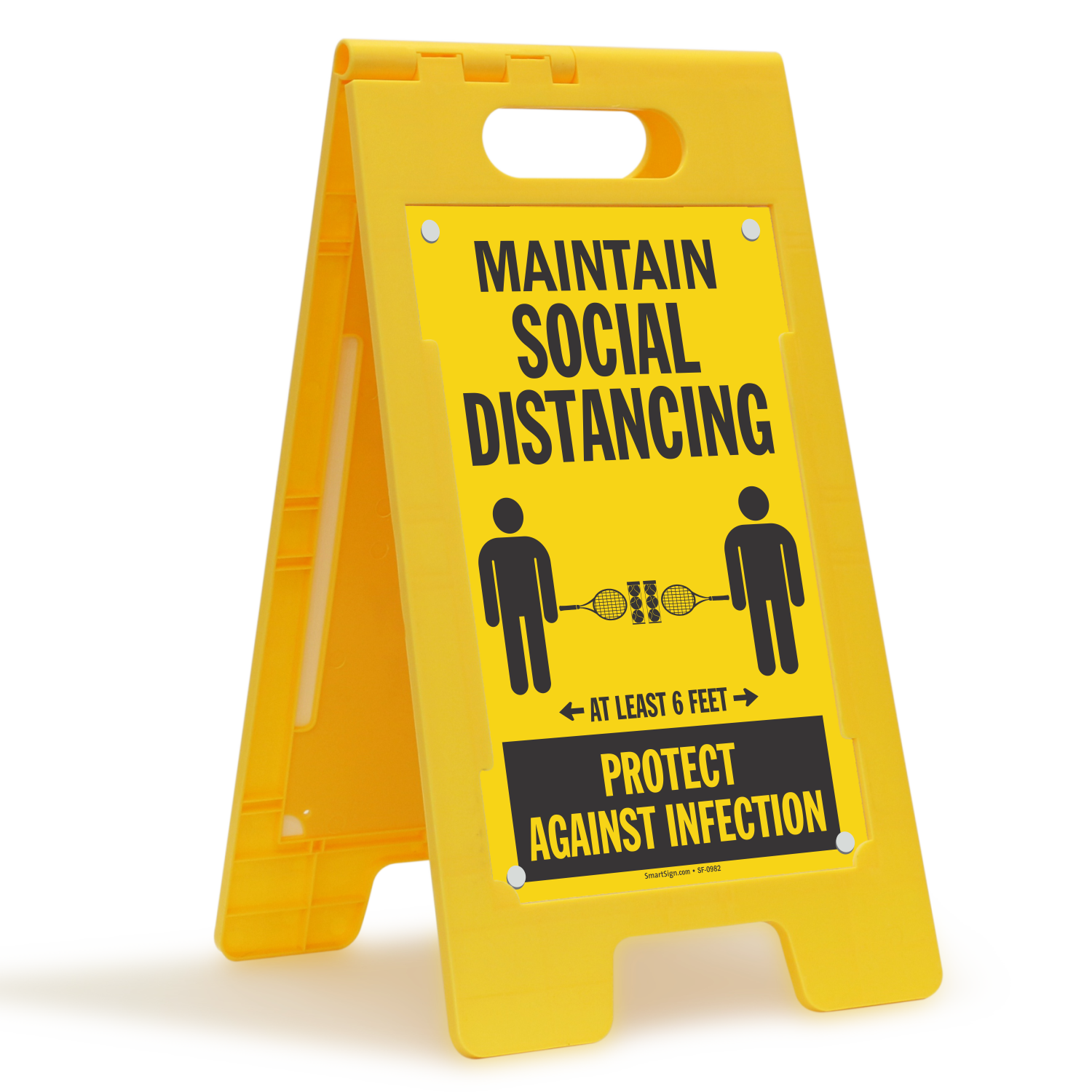 Explain very clearly how much distance must be maintained between two individuals by taking the example of tennis rackets printed on this Standing Floor Sign.