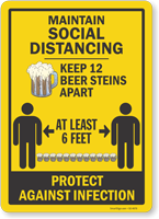 Explain very clearly how much distance must be maintained between two individuals by taking the example of beer steins - this Social Distancing Sign is easy to understand.