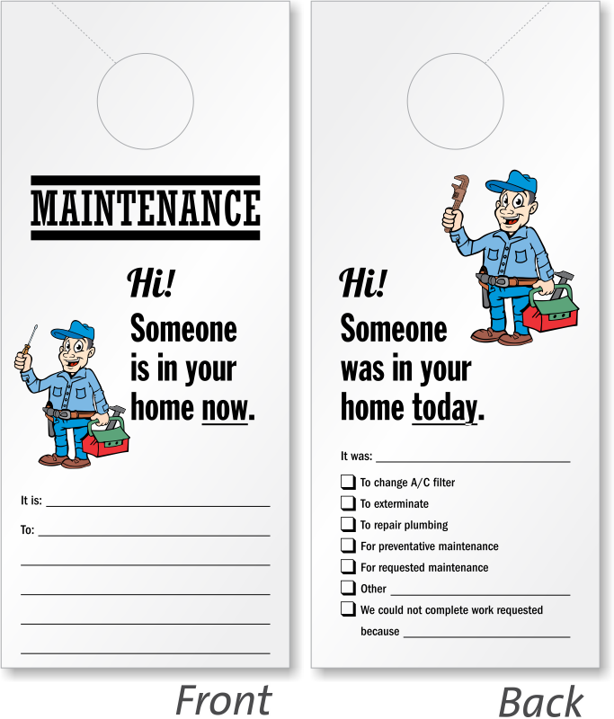 Display the front side of this 2-Sided Apartment Maintenance Door Hanger to inform residents about the presence of maintenance personnel at home, while turn the tag to display the back side and inform that the staff has left after finishing the work.