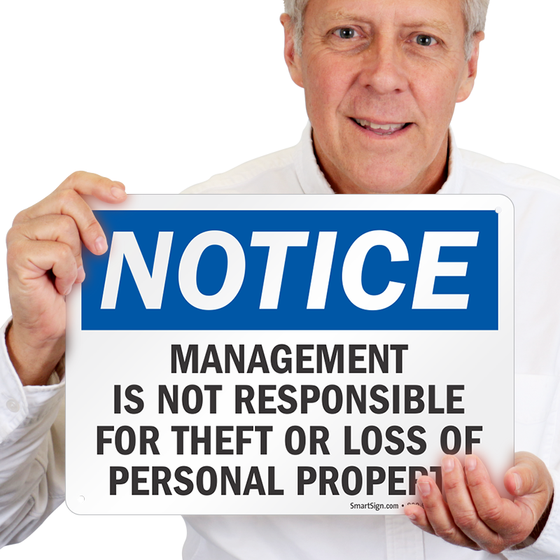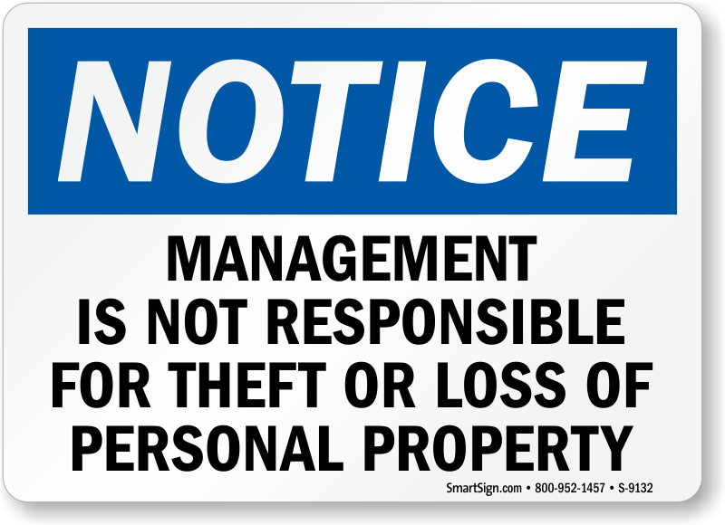 Notice Company Not Responsible Sign: Management Is Not Responsible For Theft Or Loss Of Personal Property S-9132