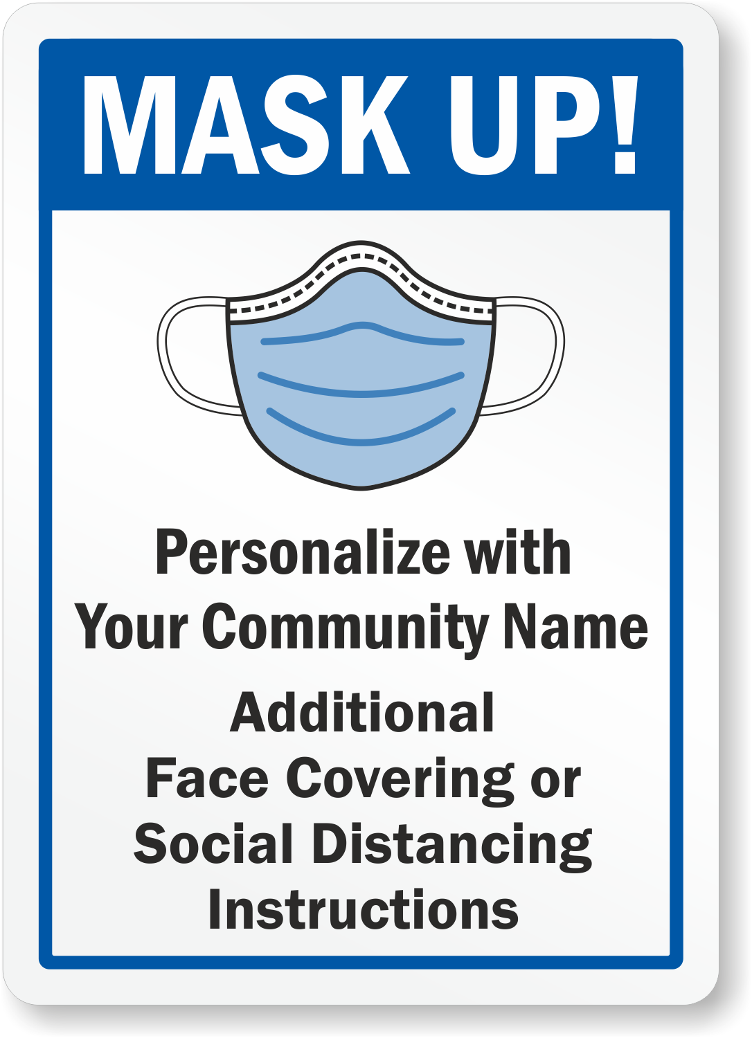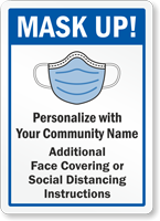 Emphasize the use of face masks with this custom sign. Add your community name and social distancing instructions within minutes.