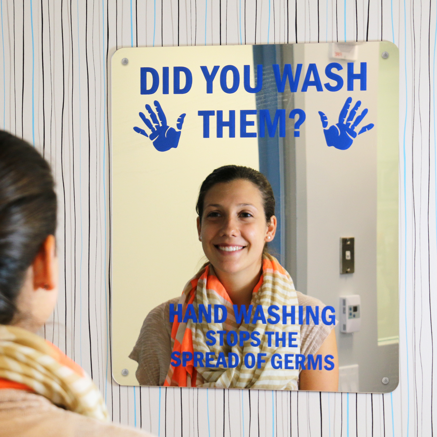 Did You Wash Them? Hand Washing Stops The Spread of Germs. This hand washing Mirror Safety Message Sign is the perfect way to enforce handwashing at all times. Each sign uses bold colors, so your message reaches out to a bigger audience. Provide a constant yet unintrusive reminder that proper cleanliness is required. Each attention grabbing message stands out. Hand washing signs are your most important line of defense in the spread of illness.