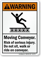 ANSI Warning Sign: Moving Conveyor, Risk Of Serious Injury Do Not Sit Walk Or Ride On Conveyor (With Graphic) S2-0779