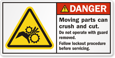 Gears Pinch Point Entanglement Danger ANSI Label: Moving Parts Can Crush And Cut, Do Not Operate With Guard Removed, Follow Lockout Procedure Before Servicing LB-0280 Learn More...