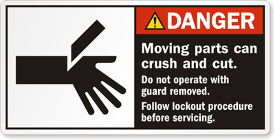 Danger Safety Label: Moving Parts Can Crush And Cut, Do Not Operate With Guard Removed, Follow Lockout Procedure Before Servicing LB-0179 Learn More...
