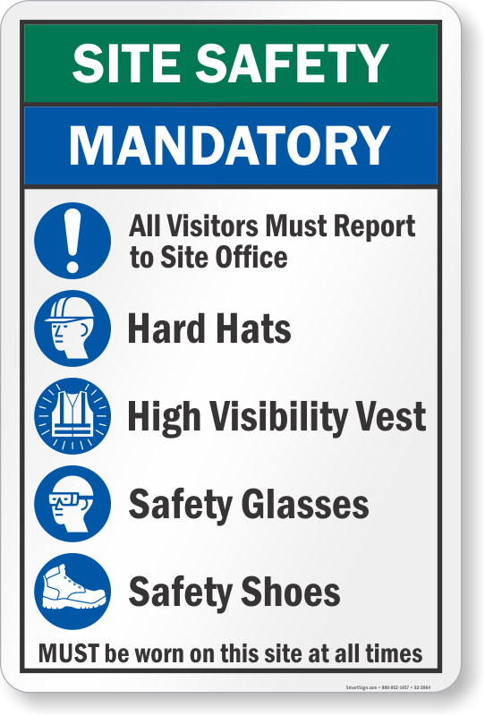 Job site safety is important. Install this sign enlisting mandatory actions and PPE ought to be taken by workers and visitors.