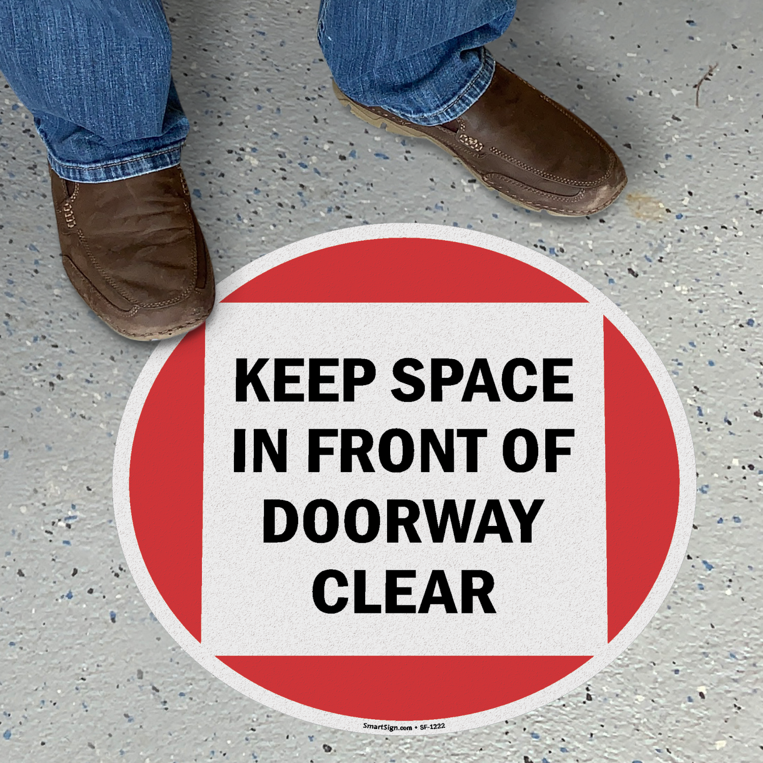 Keep space in front of doorway clear Floor Sign communicates the need to maintain a safe distance.