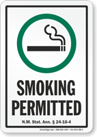 In New Mexico, smoking is permitted in private residences, tobacco stores, gaming facility, casino or bingo parlor, designated outdoor smoking areas, private clubs, in limousines under private hire, enclosed areas within restaurants, bars, and some parts of hotel and motel. Our New Mexico Smoking Sign mentions the state smoking regulation number - N.M. Stat. Ann. § 24-16-4 .
