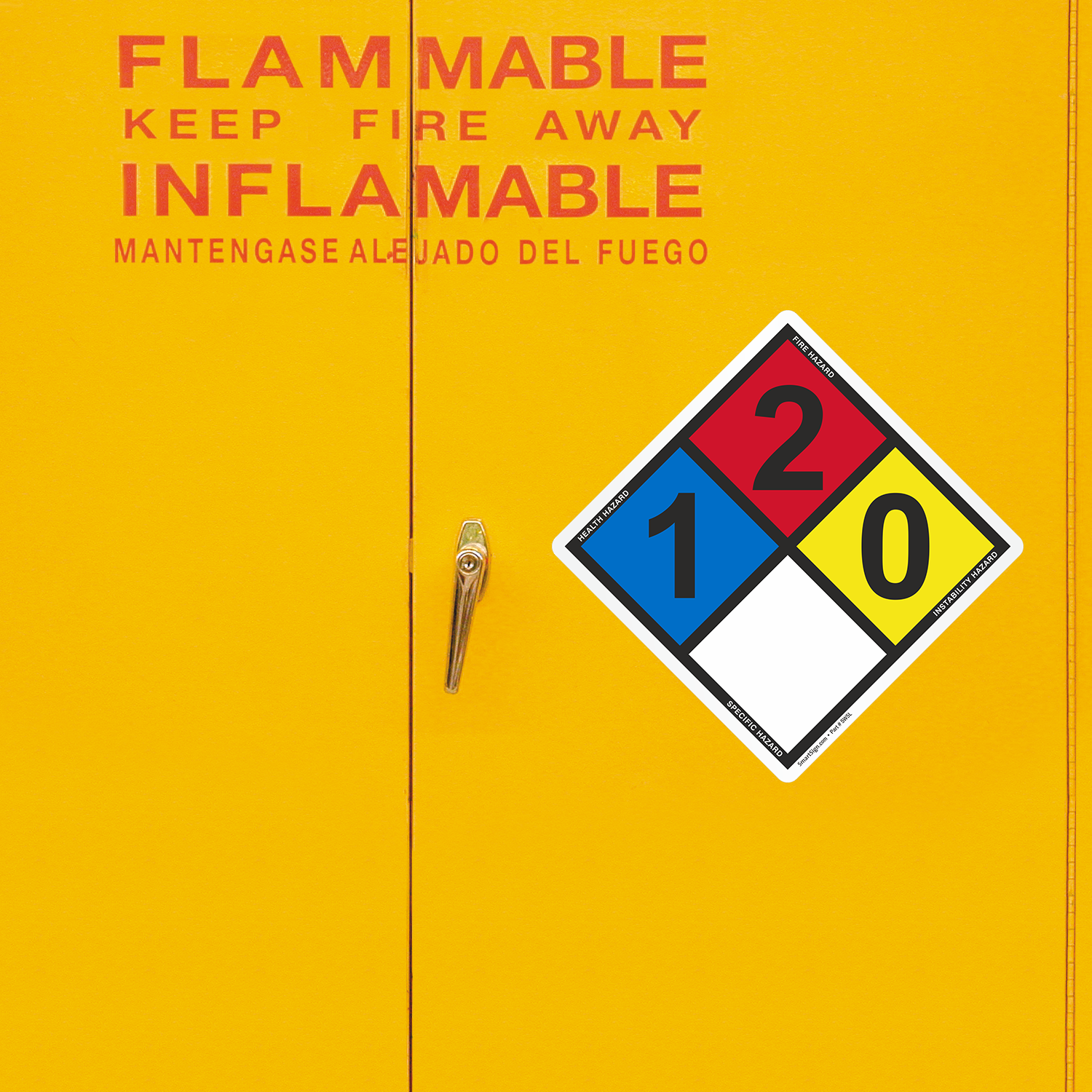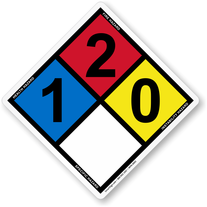 Alert staff and first responders to potential chemical hazards with an NFPA sign. This sign features a blue health hazard of 1 indicating a slight hazardous health warning. Red 2, indicates flash point is below 200 degrees and yellow 0, indicates instability warning is stable.