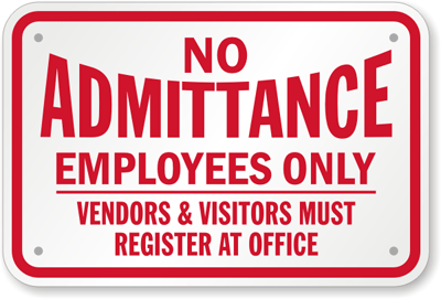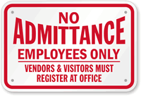 No Admittance Sign: Employees Only, Vendors & Visitors Must Register At Office K-9313 Learn More...