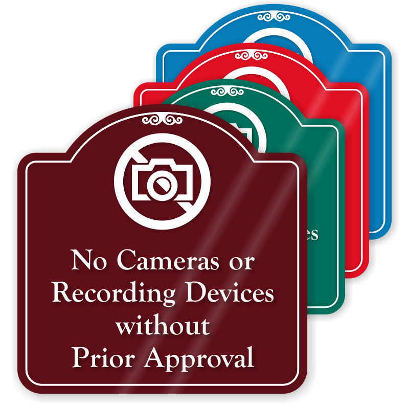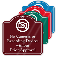 Draw attention to your message with this attractive designer sign. Prohibit use of cameras and video recording devices.