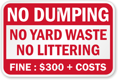 No Dumping Sign: No Yard Waste, No Littering, Fine: $300 + Costs K-9363 Learn More...