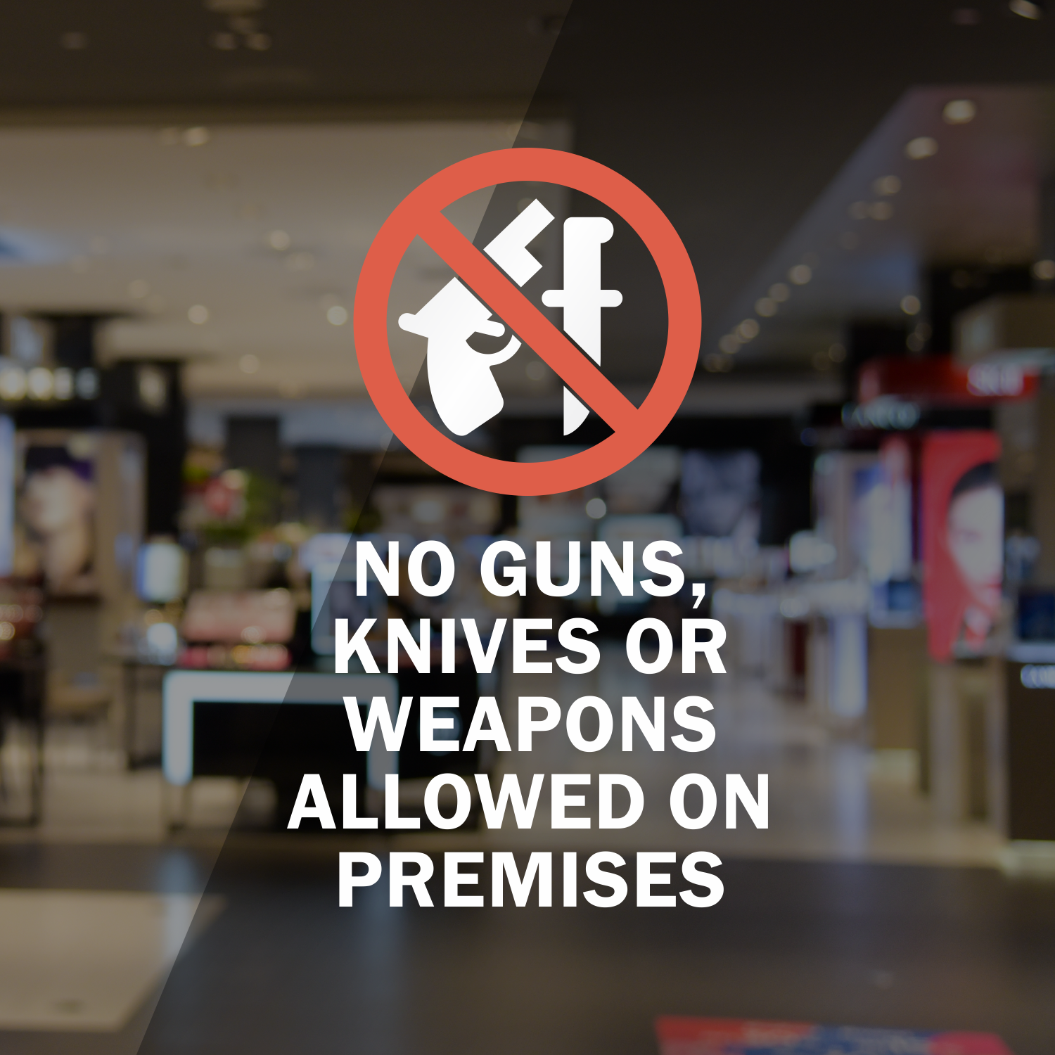 Need a classy label to convey your gun law? You've come to the right place. This professional-looking Die Cut Glass Window Decal makes for a perfect application on glass surfaces and displays your message—No Guns, Knives Or Weapons Allowed On Premises—on outside of the glass surface. Easily understandable No Weapon Symbol leaves no room for ambiguity.