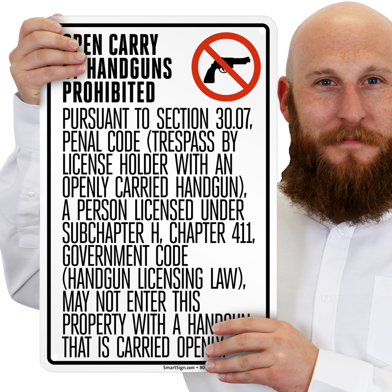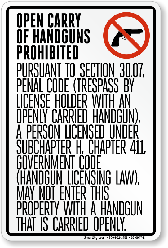 No Open Carry Sign, Texas: No Open Carry Sign, Texas §30.07 wall sign in English S2-0947-E Learn More...
