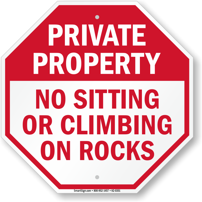 Private Property Sign: No Sitting or Climbing on Rocks Learn More...