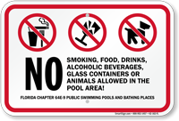 Prevent others from smoking or bringing food, drinks, alcoholic beverages, glass containers or animals near the pool with this prohibition sign. Sign complies with Florida regulations.