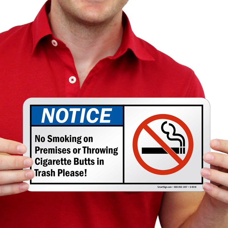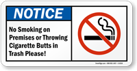Cigarette Butt Sign: Notice - No Smoking On Premises Or Throwing Cigarette Butts In Trash Please! (With No Smoking Symbol) S-9218