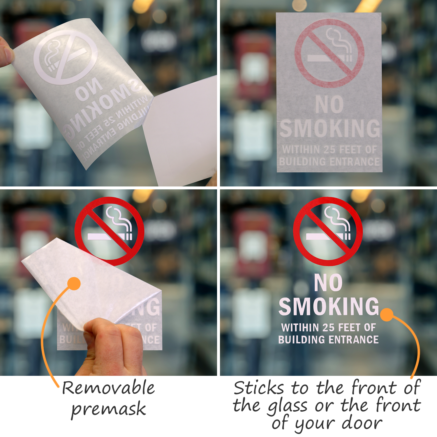 Do away with handwritten No Smoking messages. Use our highly professional-looking Die-Cut Window Decal to prevent smoking within 25 feet. Installation on glass surface takes no or little effort.