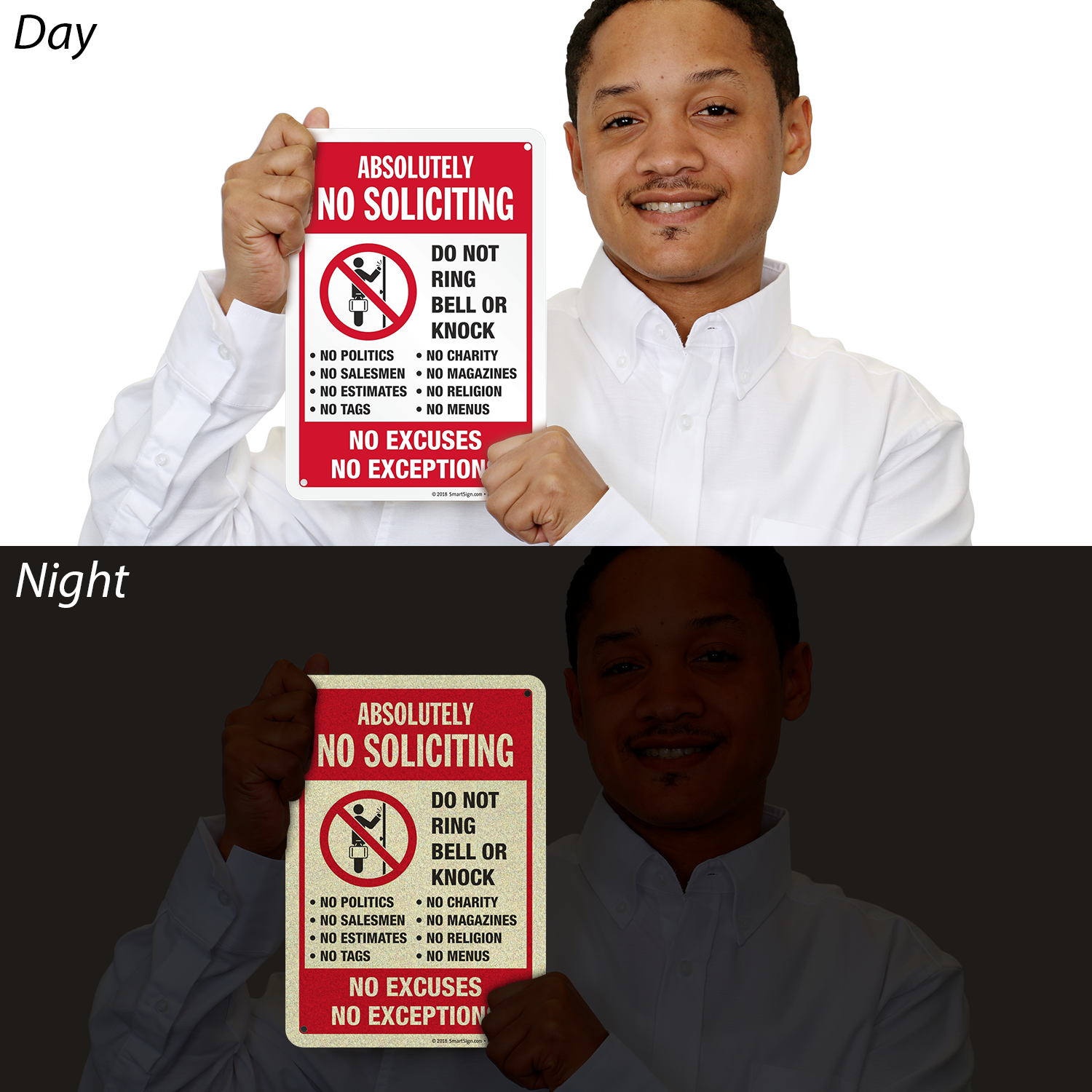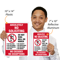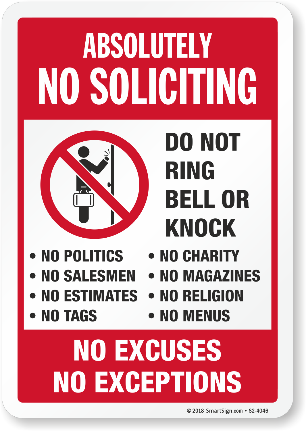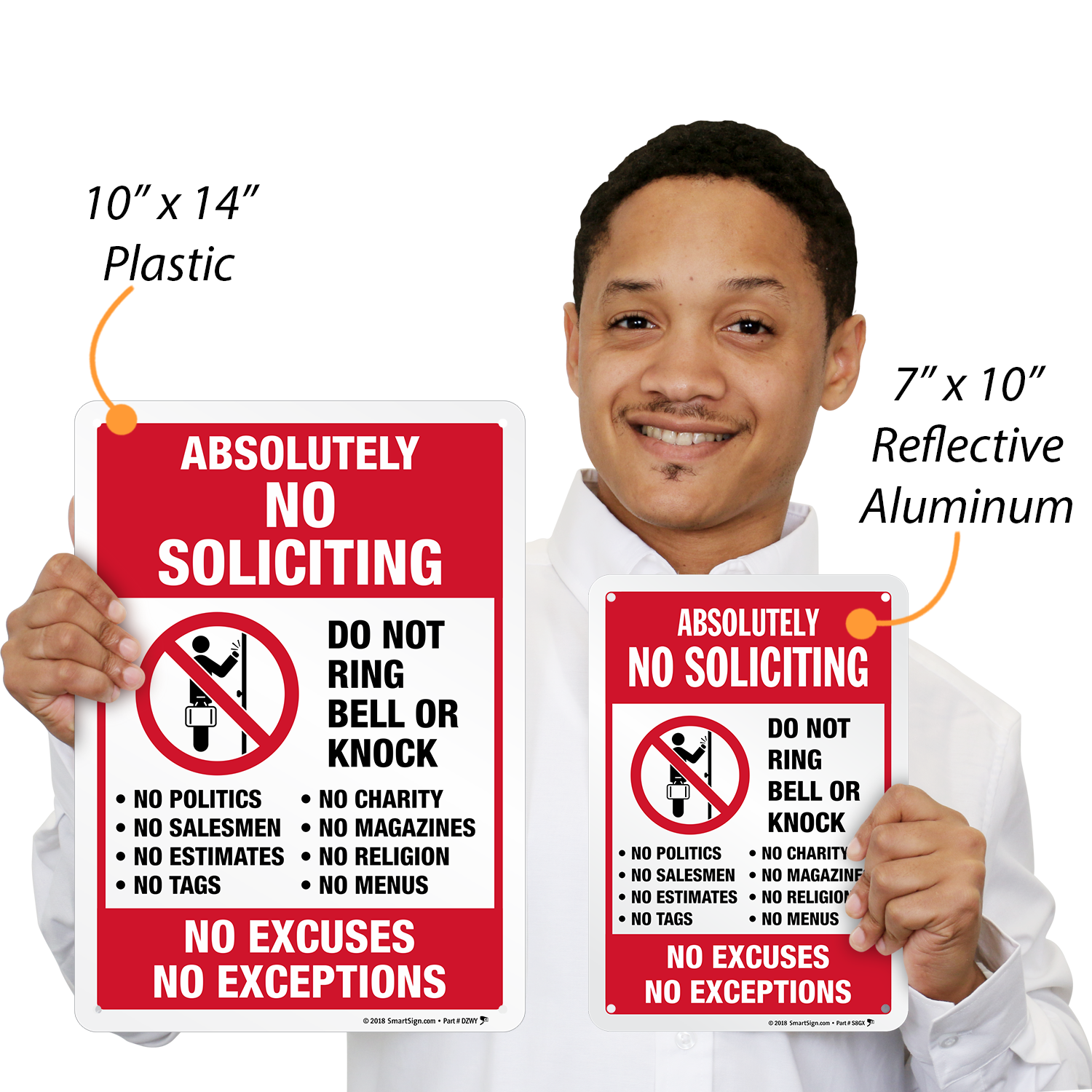 No Soliciting Sign: Absolutely No Soliciting - Do Not Ring Bell Or Knock, No Excuses, No Exceptions S2-4046