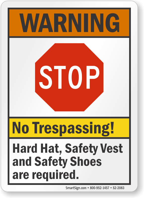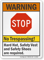 Stop Warning Sign: No Trespassing - Hard Hat, Safety Vest And Safety Shoes Are Required S2-2083 Learn More...